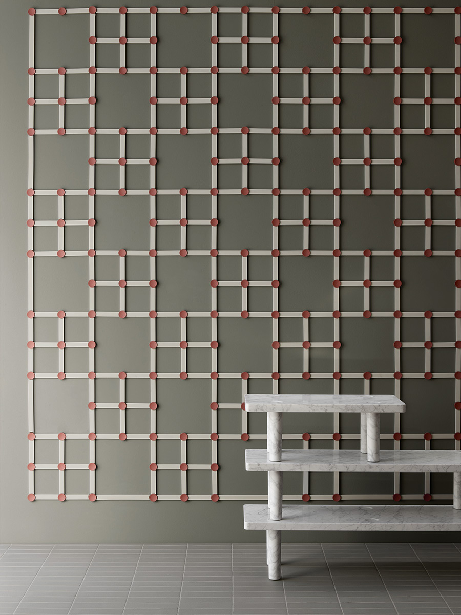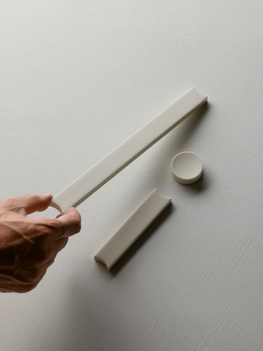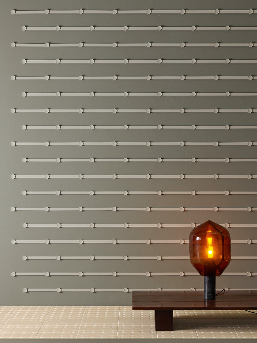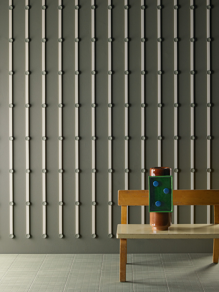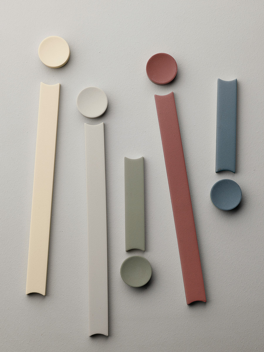 Колекція Aria задумана для створення візуальних партитур на стіні. Складена з тонких стрижнів, з’єднаних невеликими круглими елементами. Колекція представляє новий спосіб заселення порожнечі, дозволяючи стіні дихати через відкриту та гнучку сітку, яка надає простору глибини та ритму. Aria складається з двох фігурних стрижнів: 2,6×29 см та 2,6×12,8 см, та круглого елемента розміром – Ø 4,2 см. Усі вироби виготовлені з неглазурованої керамічної плитки з використанням повнорозмірної кольорової глини. Круглий елемент Button та два стрижні Strip S та Strip L доступні у п’яти відтінках: White, Chalk, Earth, Arctic, Olive. Поєднання двох стрижнів із круглим елементом дозволяє створювати нескінченні конфігурації, які, працюючи в синергії зі стіновими фарбами, створюють захопливі ігри світла та тіні. Це можливо як у приміщенні, так і на вулиці. Як і Adagio, Aria необхідно наносити безпосередньо на готову поверхню стіни.