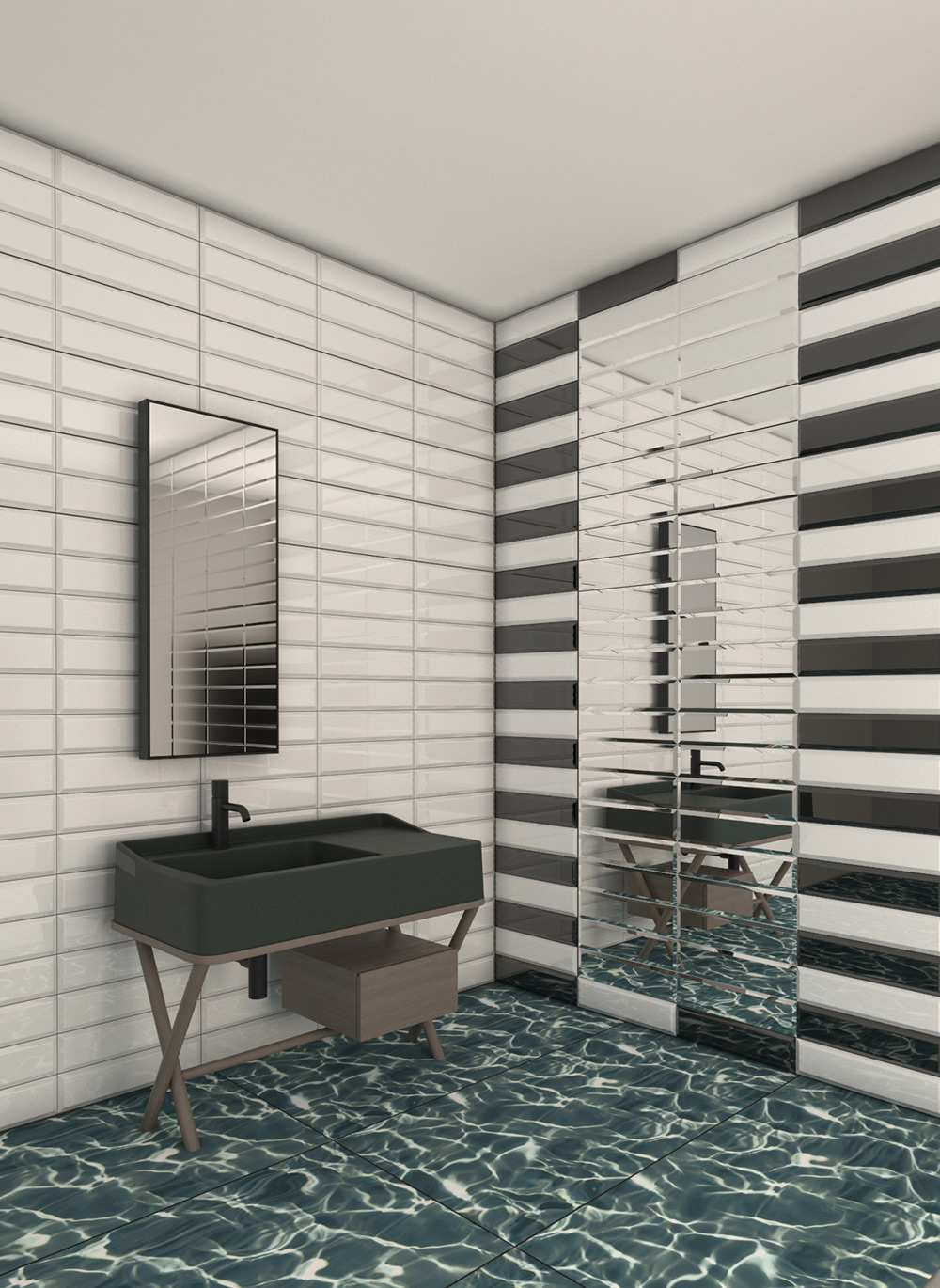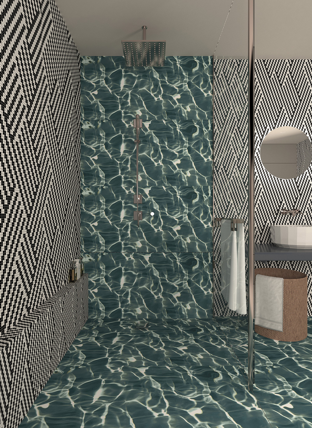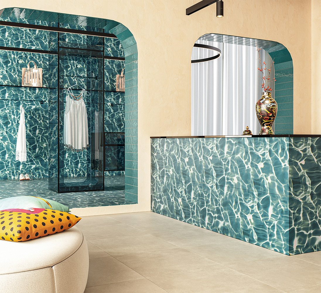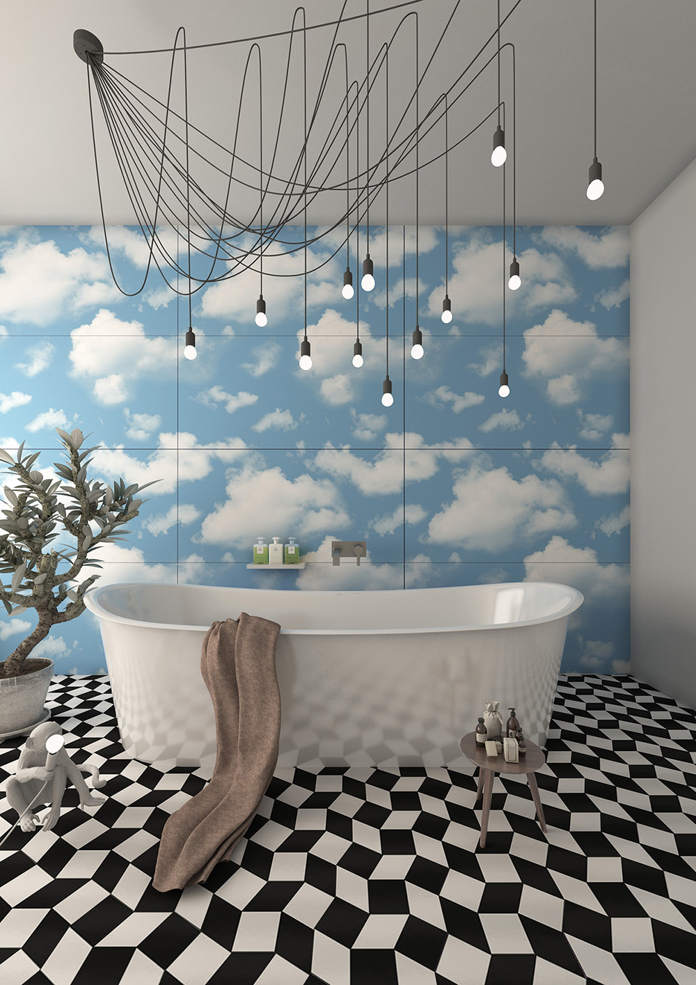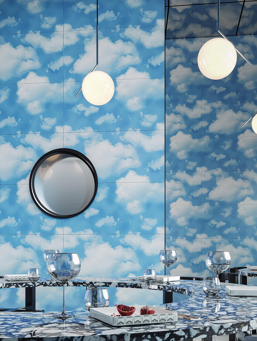 Плитка Elements – це серія, головними героями якої є природа та її елементи, вода та хмари. Завдяки великому розміру плитки 60×120 см можна комбінувати з малюнками A+B. Можна створювати середовище магії зовнішнього світу в інтер’єрі. Таким чином, стає можливою прогулянка блакитним небом, усіяним м’якими хмарами, або відчуття оповитості кришталево чистою водою, де сприйняття простору радикально перевертається.