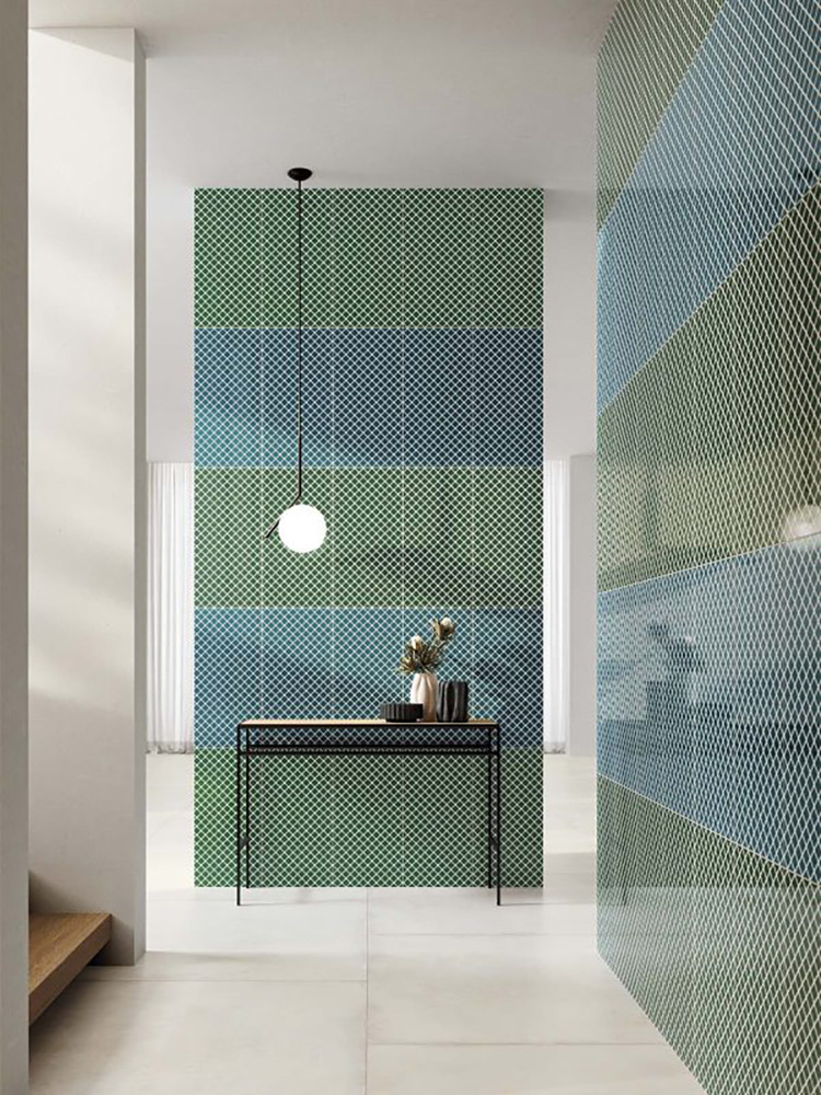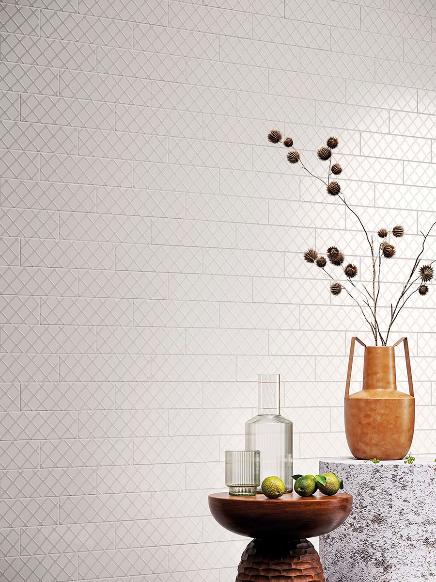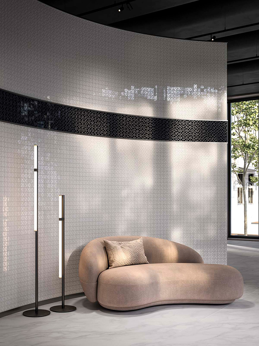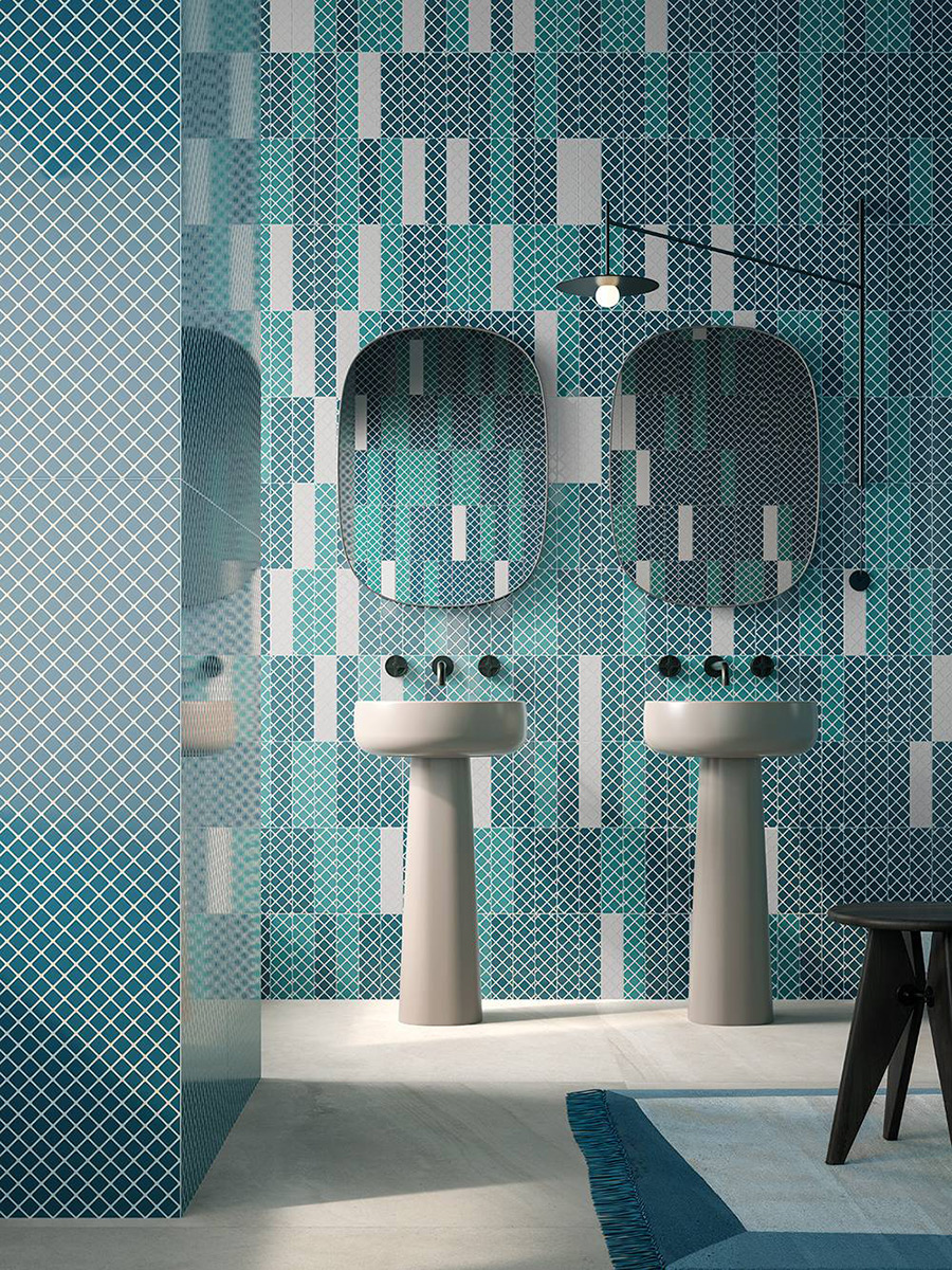 Плитка Upside – це вибух кольору, графічного дизайну та блиску. Результатом є розширена, ультрадекоративна пропозиція з вражаючим візуальним ефектом та, перш за все, безмежним потенціалом. Геометричний візерунок – це відмінний елемент, а також своєрідна ланка між двома лініями, яку можна застосовувати до кількох форматів, навіть великих, які час від часу змінюють своє композиційне сприйняття. Завдяки строкатій кольоровій палітрі, що складається з восьми відтінків, з якими можна гратися в комбінаціях і таким чином створювати атмосфери різної інтенсивності. Мозаїка 30×30, єдиний формат оригінального дизайну, складається з випадково підібраних плиток 5×5, на які потім розбивається сітка. У новому варіанті цегли 6,3×29 сітку можна переміщувати шляхом укладання в шаховому порядку, створюючи динамічний ефект на стінах. Таким чином, Upside відображає не лише еволюцію продукту, але й дизайну.
